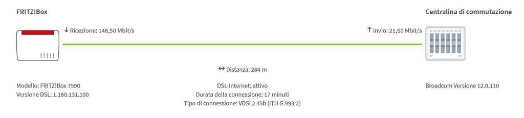 Informazioni sul mio setup: FritzBox 7590 su FTTC, in teoria dovrei essere senza derivazioni e connesso alla prima presa disponibile in casa mia.