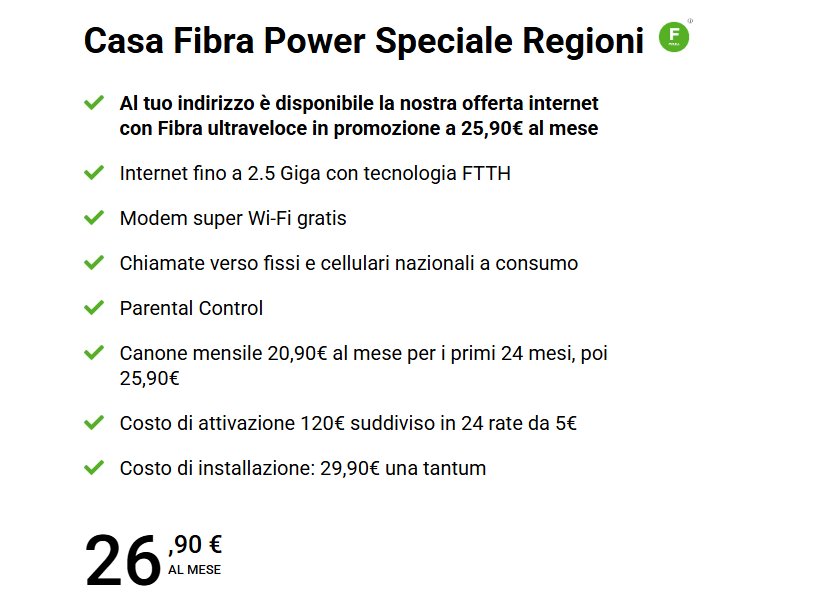 Parabellum Vedo che TIM è stata aggiunta alla lista, ma provando a fare la verifica copertura mi risulta solamente FTTC. C'è qualche criterio che mi sfugge? Dove abito c'è solamente OF con PI1G.