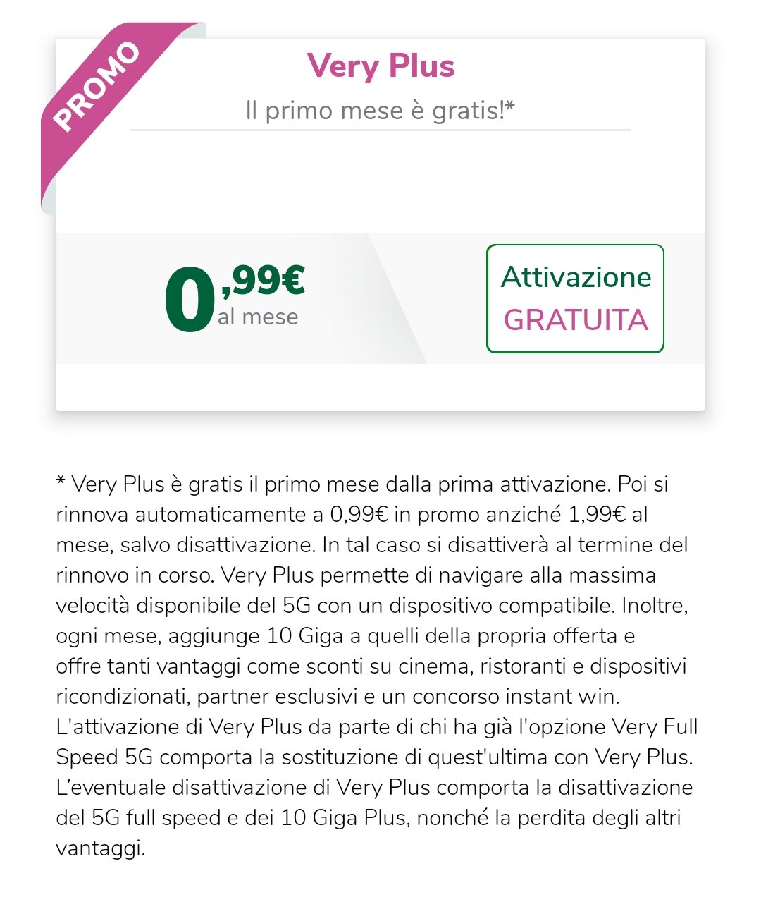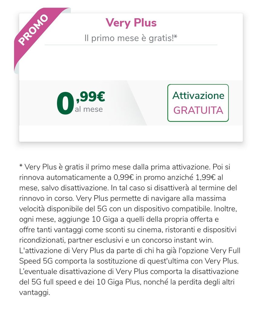 Gabbo _Lex_ a me Very ha detto che attivando Very Plus pagherei comunque 0,99€ in più al mese, perché la Full Speed 5G è gratuita (ho l’offerta da 5,99€)