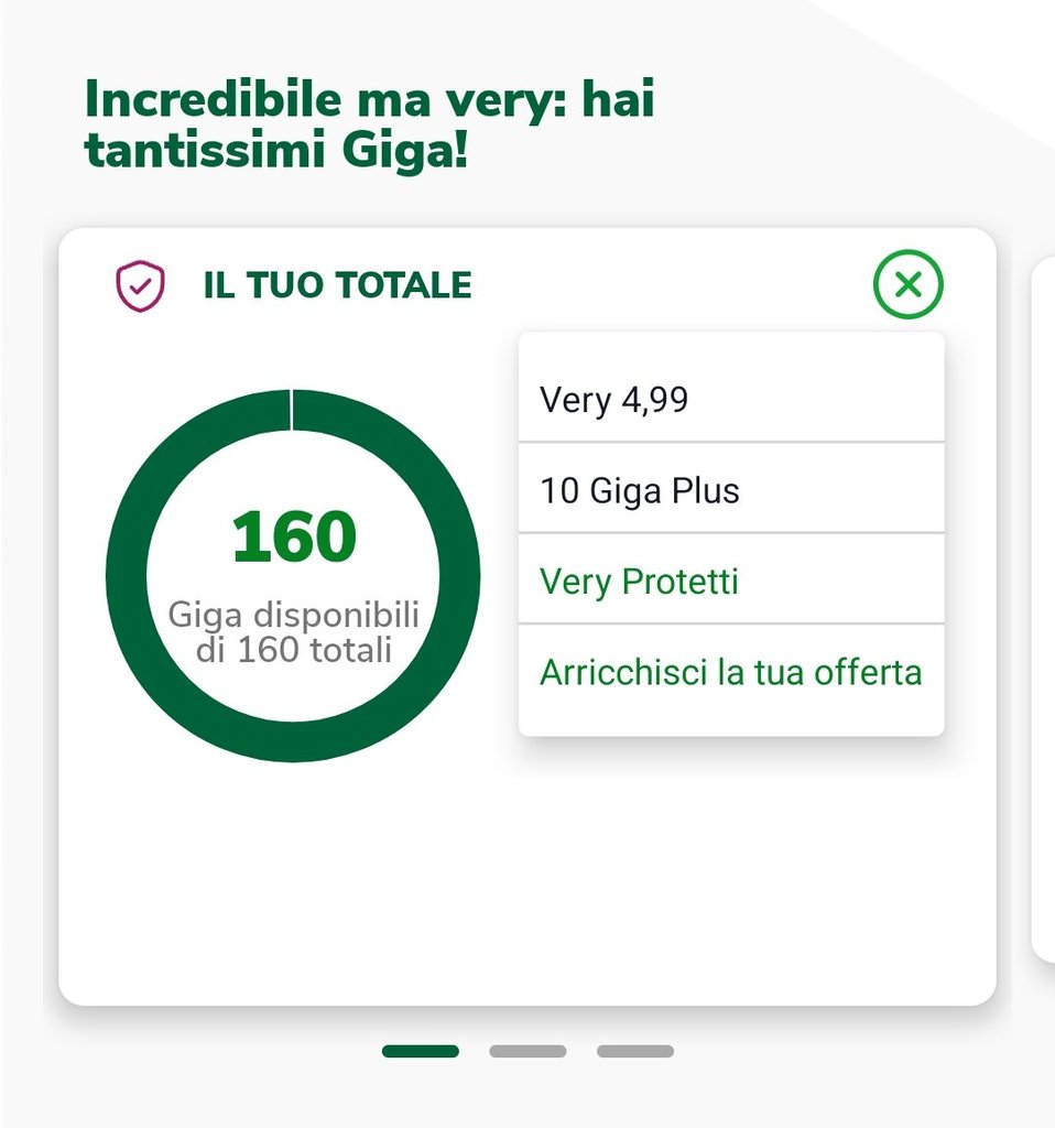 mitch_el _Lex_ qualcuno ha attualmente Very Plus e saprebbe dirmi gli sconti di Luglio? No, ma cliccando su Tuffati in Very Plus mi fa riattivare l'offerta col mese gratuito se ti va di provare😂 Ho anch'io i 10GB rinnovati per qualche motivo. PS: Se hai ancora problemi con Giga Green, io ho mandata una segnalazione a caso meno di un mese fa e ora che l'hanno chiusa mi funziona. Non si blocca più l'app! 😱
