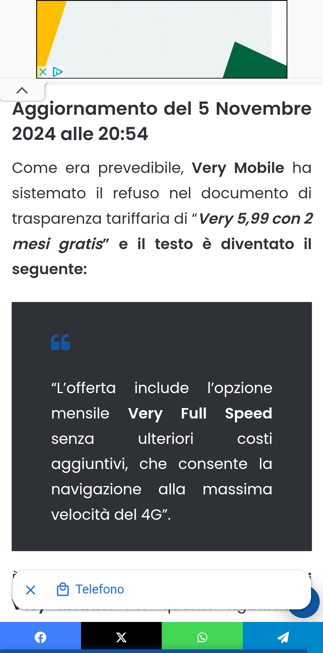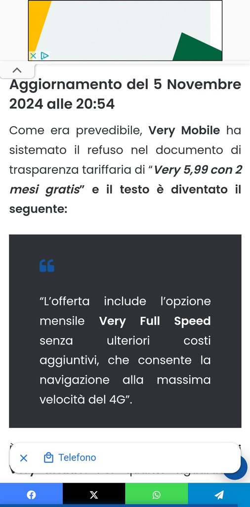 _Lex_ Nei documenti di trasparenza tariffaria di una nuova offerta lanciata oggi, 5 novembre 2024, il semivirtuale Very Mobile ha indicato, molto probabilmente per errore, che l’opzione mensile Very Full Speed permetterebbe la navigazione alla massima velocità del 5G. Fonte: https://www.mondomobileweb.it/290241-very-mobile-sta-per-lanciare-la-rete-5g-refuso-o-una-prossima-realta/