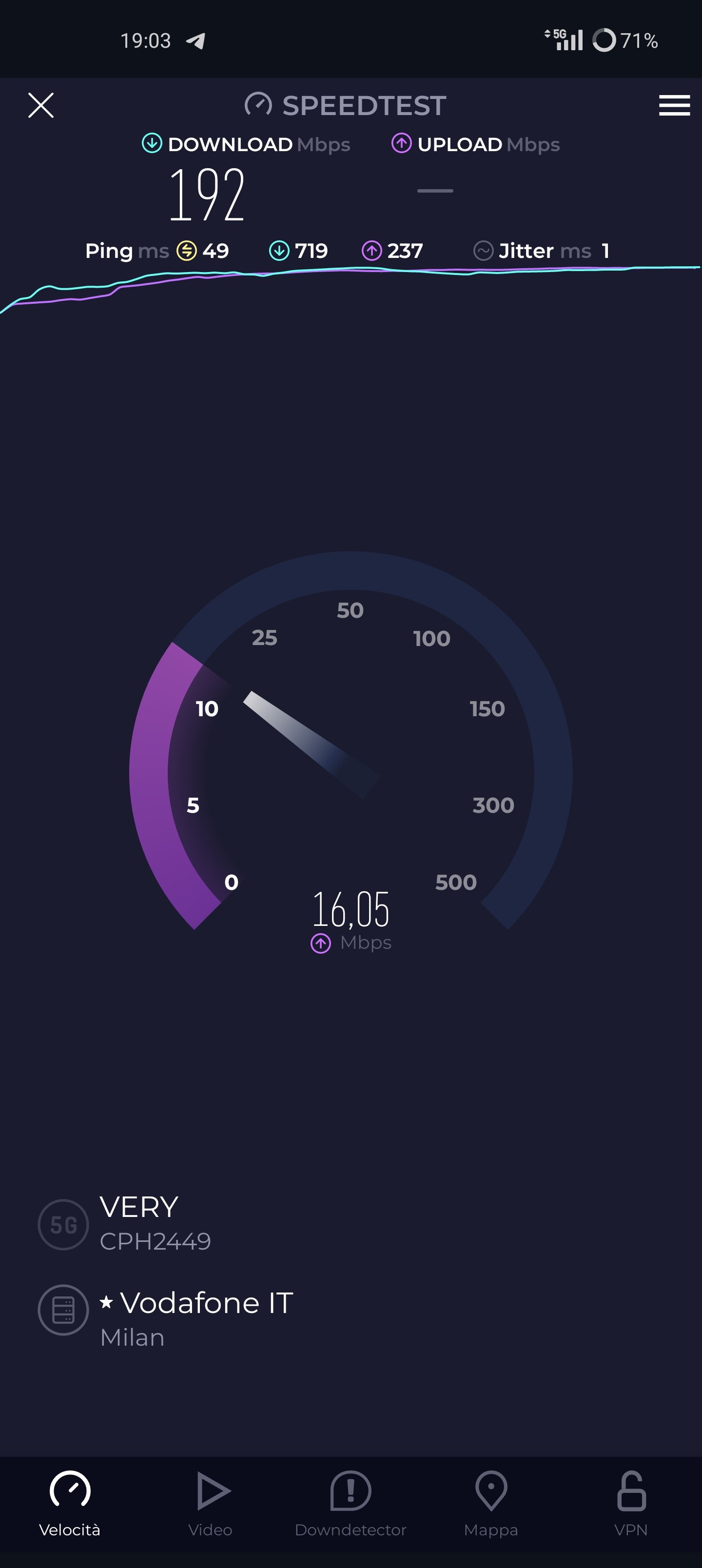 porf Jeff9 192 mbps in 4G sono rari da vedere, fosse stato un errore del telefono non credo avrebbe avuto questi risultati. 192mbit in 5g però sono davvero pochi, poco più di un 4g