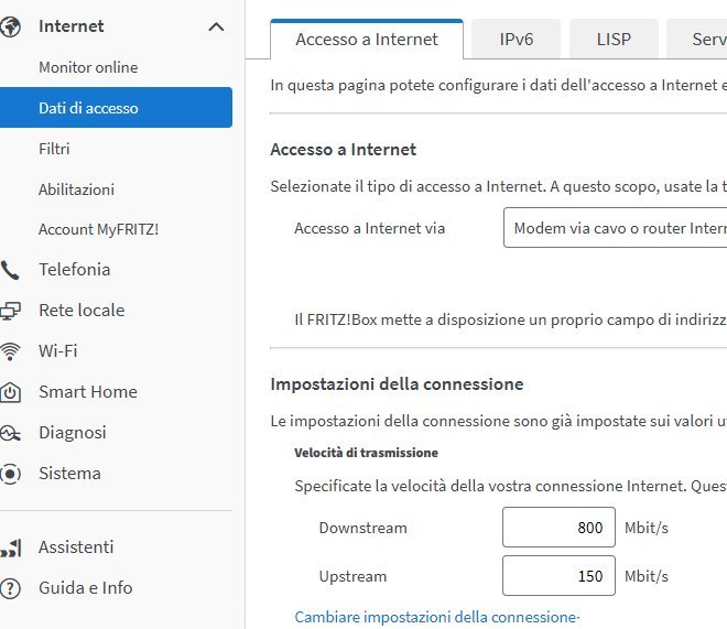 Si tratta di Internet/Dati di accesso/Impostazioni della connessione/velocità di trasmissione.