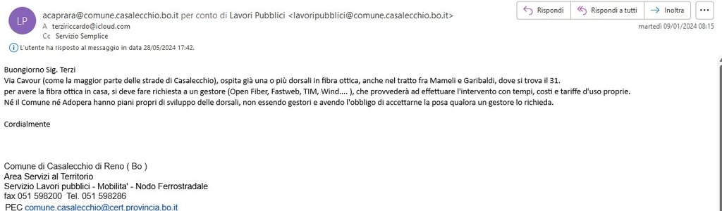 scrivo per condividere la mia frustrante esperienza con la richiesta della fibra ottica nel mio quartiere a Casalecchio di Reno, in provincia di Bologna. Allego un'immagine per illustrare meglio la situazione.