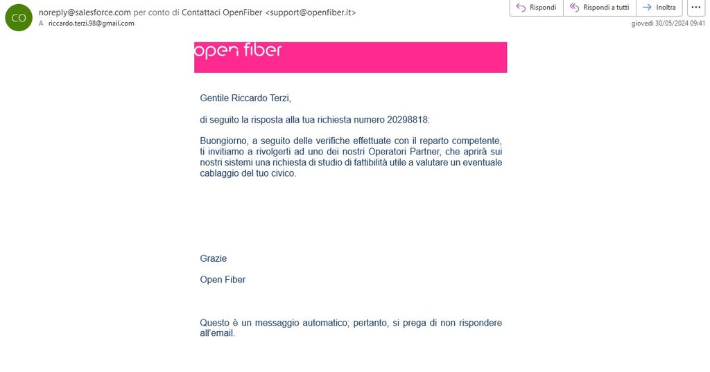 Ho tentato ripetutamente di contattare Open Fiber, che è praticamente impossibile da raggiungere via ticket. Di recente, Open Fiber mi ha risposto suggerendomi di contattare un operatore partner per richiedere uno studio di fattibilità, cosa che avevo già fatto senza risultati.