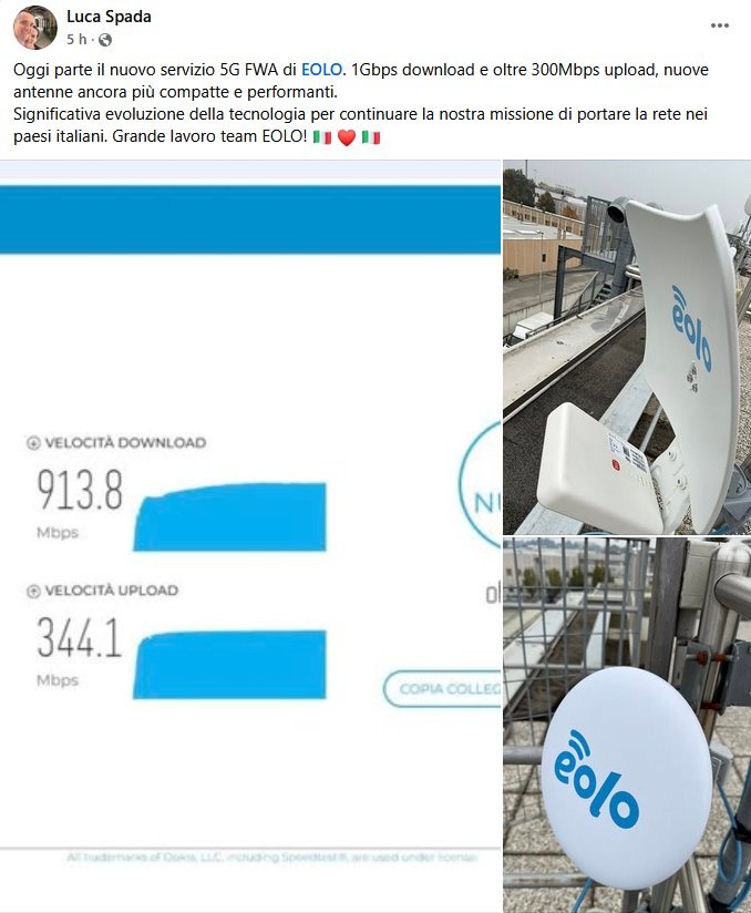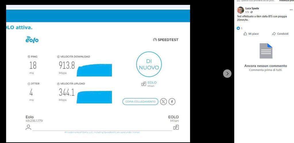 enricoz lore924 L'AD di Eolo ha condiviso questo speedtest Considerando distanza dalla BTS e presenza di pioggia mi sembra molto promettente. Questi gli apparati