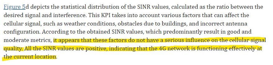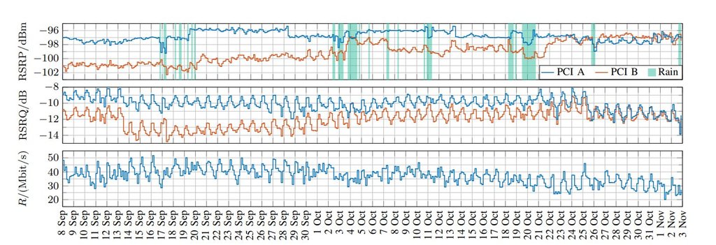 Questo paper nel dettaglio non si occupa di vedere come il meteo disturba una connessione radio, quanto più in un punto dell'articolo, come osservazione, fanno notare che alcune "short-term anomalies" sono state registrate proprio in corrispondenza di piogge, impattando sull'RSRP delle due celle dell'esperimento. Ciò non va a incidere però nè sul RSRQ (qualità del segnale) nè tantomeno sulla velocità di connessione tra l'antenna e le due celle. Questo paper conclude che solamente l'RSRQ e R (rate di connessione) subiscono picchi di minimi e massimi nelle ore di picche standard, visto che le celle sono più congestionate o meno in determinati orari della giornata, mentre invece l'RSRP rimane un valore stabile per tutto il periodo di osservazione.