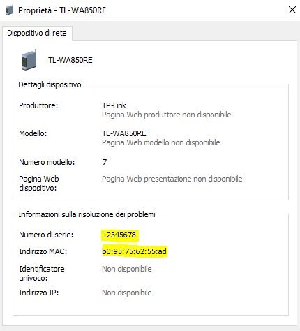 numero di serie palesemente inventato, e il mac address invece che corrisponde, facendo un mac address lookup su internet, effettivamente a un dispositivo tp-link.