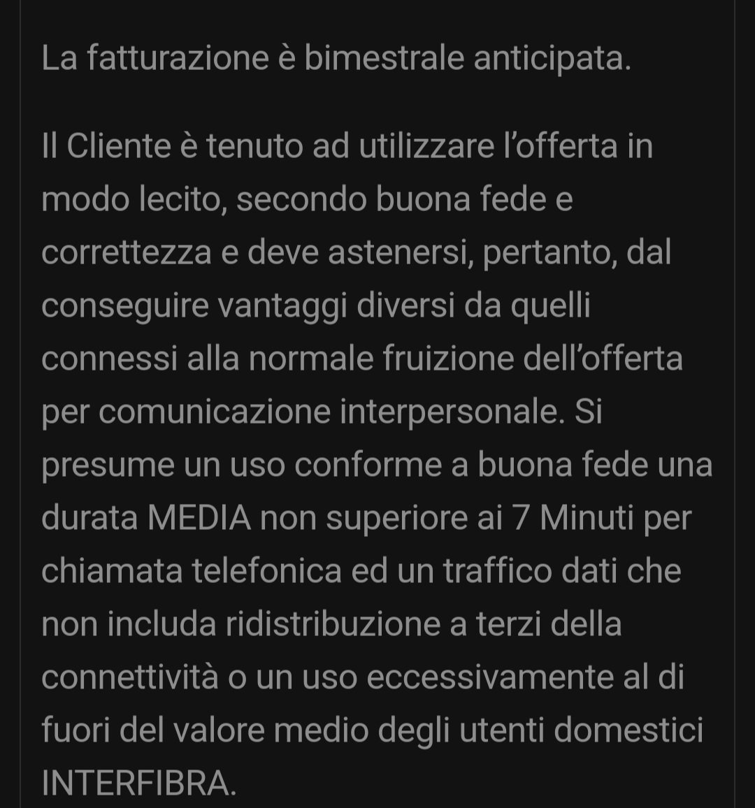 gdm_itf Paoloqu24 sul vostro sito, ho trovato questo limite che non so come interpretare, cioè se supero 7 minuti di chiamata, verrà sospesa l'offerta? La descrizione fa riferimento "alla buona fede sull'utilizzo" del traffico voce in una sorta di media, in sintesi se un cliente lo usa per scopi diversi, ad esempio call center o altro, può essere soggetta a sospensione. Paoloqu24 Inoltre il traffico dati è realmente illimitati? A noi basterebbe almeno 630 giga mensili Assolutamente si, non abbiamo limiti Paoloqu24 poi una domanda importantissimo, risolvete anche problemi di censimento? inteso come ?