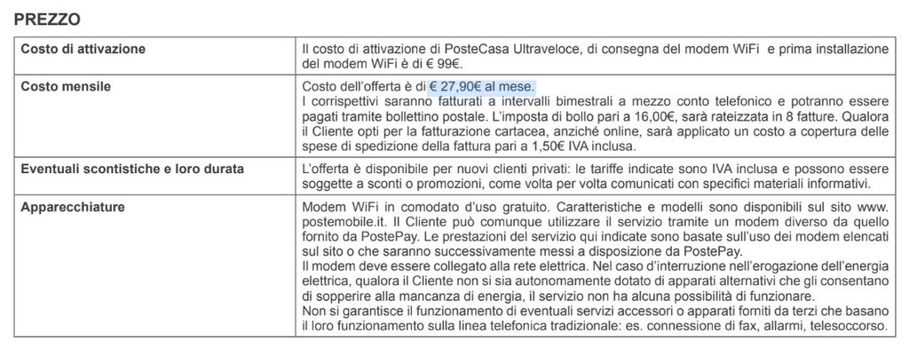 penso sia abbastanza standard. Infatti il prezzo di €21,90 è scontato rispetto ai €27,90 di listino: al punto EVENTUALI SCONTISTICHE E LORO DURATA lo spiega, seppur non riportando l'ammontare dello sconto. Il costo non scontato è corretto, ma non vuol dire che sarà quello che pagherai tu. Quello che dico è giustificato dal prezzo del contributo di attivazione riportato nel documento (€ 99 di listino) contro quello che hai pagato (€ 39).