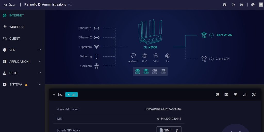 Il router lo Spitz Ax GL-X3000 nuovo di zecca e l'operatore è +++++++++= e sul telefonino dove avevo testato la scheda ( un Huawei P40 pro 5G, misurainternet, sul balcone dava un download di 250 MBPS) .