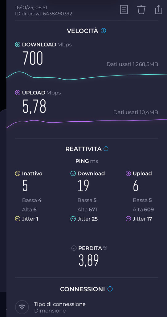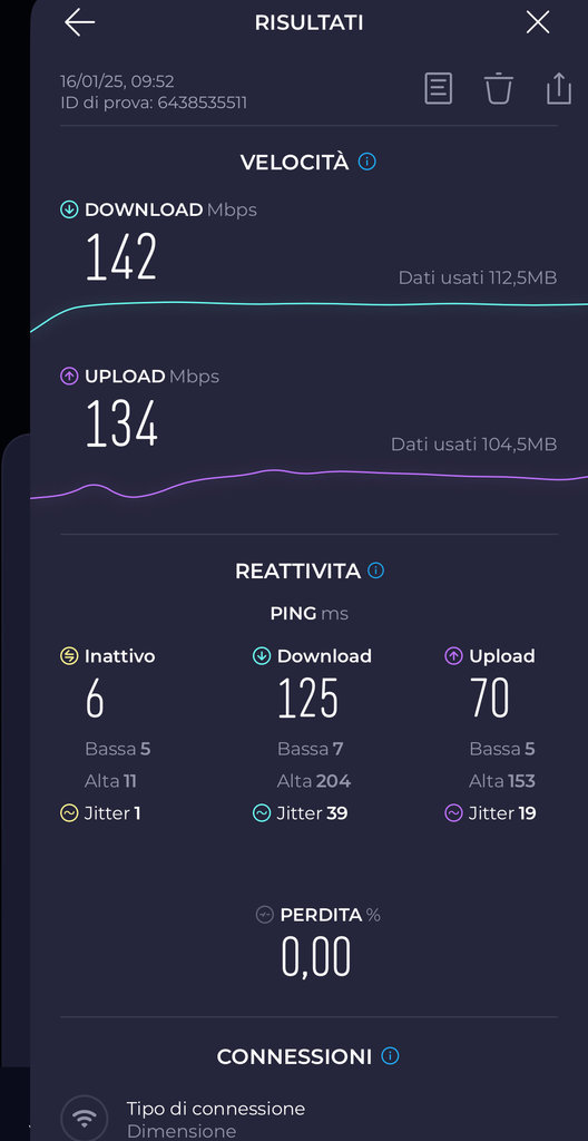 Faccio un test e questa volta upload ok ma velocità in down decisamente più bassa e deludente.