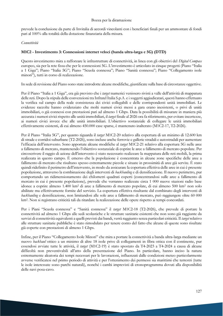 Cari lettori del forum e in particolare riguardante il Piano Italia 1Giga desideravo aprire la seguente discussione (sempre se non è già stato fatto presente) per avvisare chi può avere interesse che è online la bozza del quarto comunicato (di quest'anno 2024) che riguarda anche il discorso della banda larga e connettività in Italia; nello specifico a pagina numero: 134 del file ".pdf" scrive quanto segue riguardo anche il Piano Italia 1Giga, e Piani “Scuola connessa” e “Sanità connessa”: