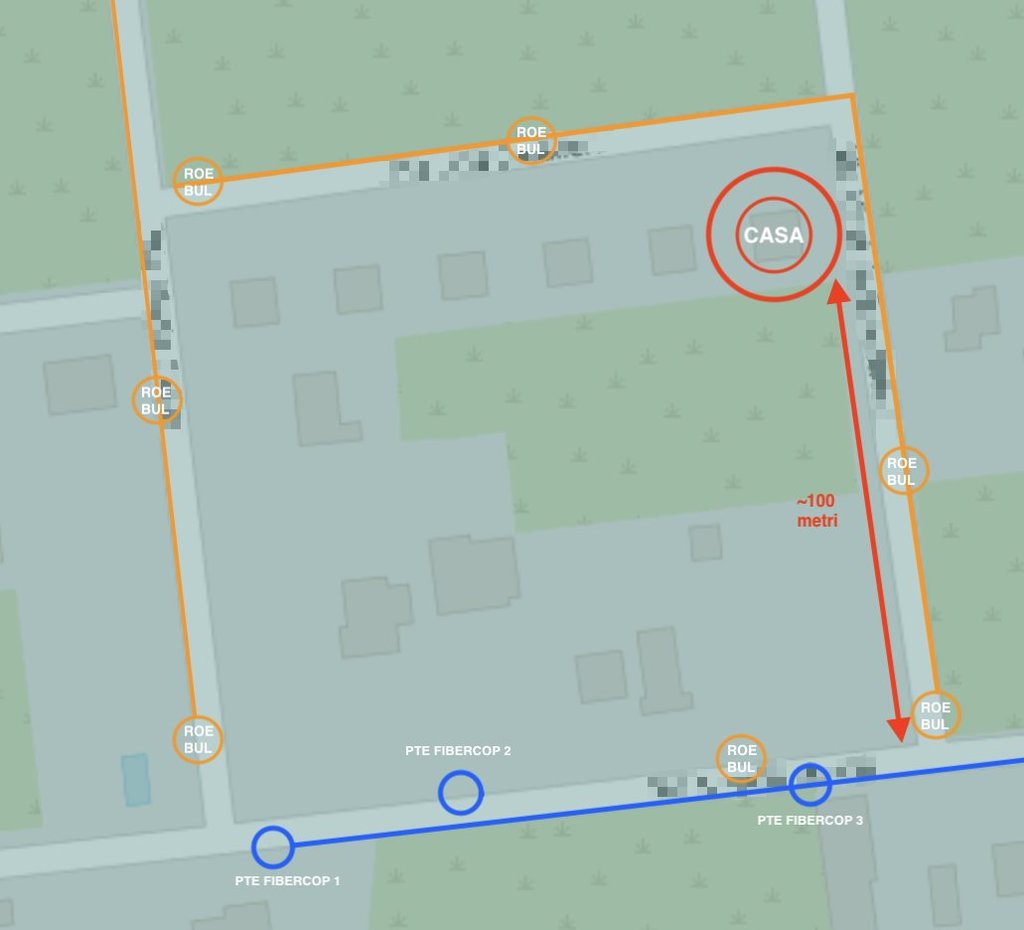 Se non ho visto male, i cavi di rame raggiungono il Fibercop 2, ma negli stessi pali non passa attualmente un cavo in fibra connesso al Fibercop. Purtroppo, la situazione sembra essere ancora più complessa di quanto illustrato, poiché molti cavi passano sottoterra.