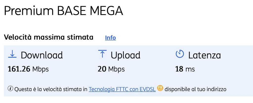 Ho una FTTC FW con vecchio modem technicolor dga4131: 26.90€ al mese ma mi caricano anche UltraFibra (+5€) e AssistenzaPlus (5€) - che da due mesi non riesco a farmi togliere. Queste le prestazioni: