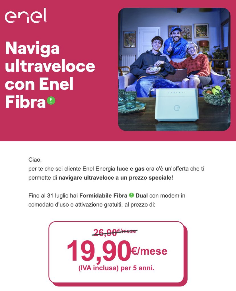 Mi arriva offerta Enel a 19.90 x 5 anni (loro dicono rete proprietaria ma gli esperti dicono che Enel non abbia linee proprie). Il call center Enel non conosce questa offerta, mi parlano del modem zyxel dx3301 in comodato