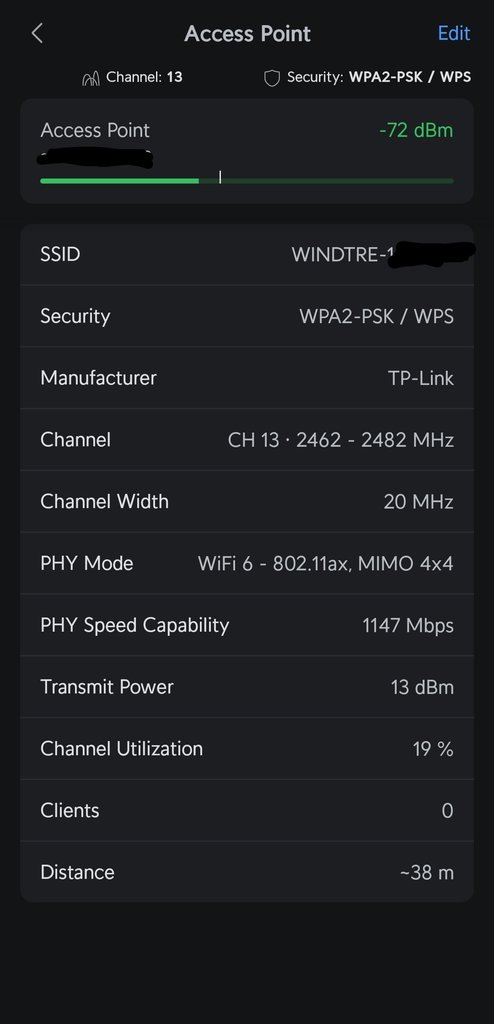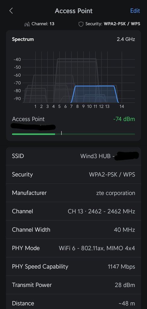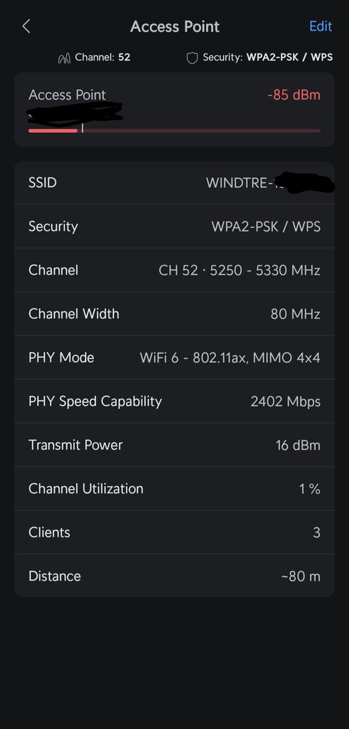 Per farti un confronto questo qua sotto è un modem che offriva windTre una decina di mesi fa, prima del Tplink attuale, si tratta dello ZTE F6645P. Questo trasmette a 28 Dbm sia in 2.4 che 5 GHz, infatti anche se molto distante prende più degli altri.