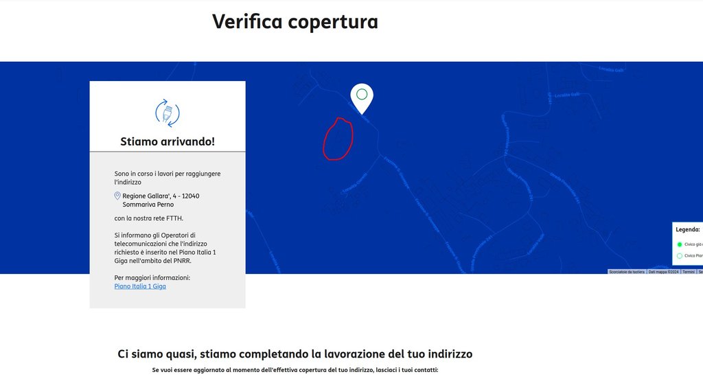 Nella foto allegata precedentemente sono cerchiate la mia abitazione insieme a quelle dei miei 2 vicini, gli unici indirizzi che se inseriti sul sito fibercop (cosi come sul sito Piano Italia 1 Giga PNRR) risultano facenti parte del piano italia 1g.
