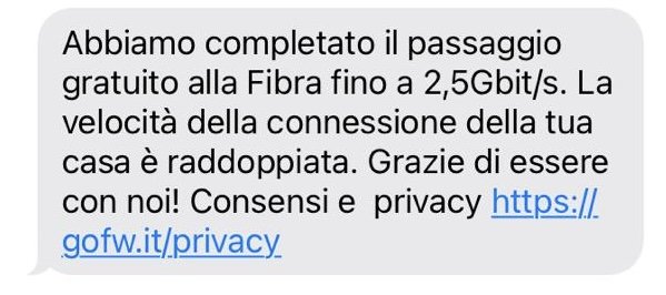 GiuseppePaglialonga chi riceverà questo SMS, non ha nulla da preoccuparsi. stiamo continuando con gli Upgrade Gratuiti per la 2500mbps, senza costo aggiuntivo o cambio della promozione. il tutto è automatico, ovviamente il router deve essere predisposto per permettere velocità a singolo dispositivo. non a caso uscirà presto il nuovo router Fastweb Seven, in molti sull'app parlando con il bot, ricevono messaggio se vogliono provarlo senza pagare nulla...