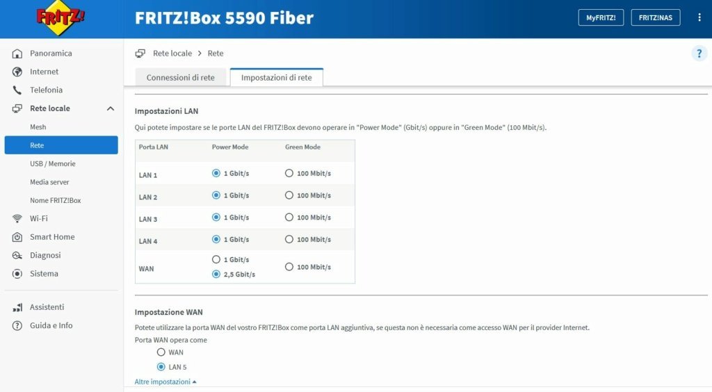 Il cavo di rete è collegato alla porta WAN/LAN del FRITZ!Box 5590 impostata a 2,5 Gbps.