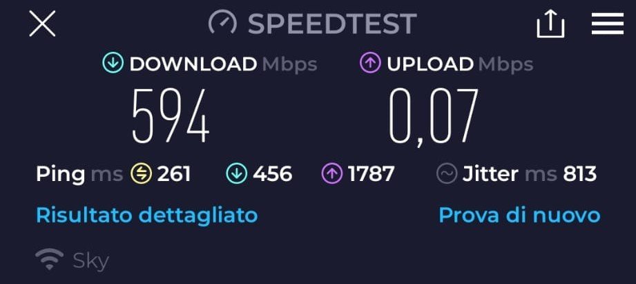 Sky si presenta con un operatore loro e un operatore di Open Fiber. Il modem, pur mettendoci molto tempo (tipo 5 minuti), alla fine parte. Stupidamente (inesperienza) non facciamo uno speed test sul momento, e alla fine quando inizio a usare internet seriamente mi rendo conto che il problema è una enorme instabilità, Ping e jitter altissimi (vi allego uno speed test, ne ho fatti mille e la situazione è spesso peggiore, va addirittura in timeout lo speed test stesso).