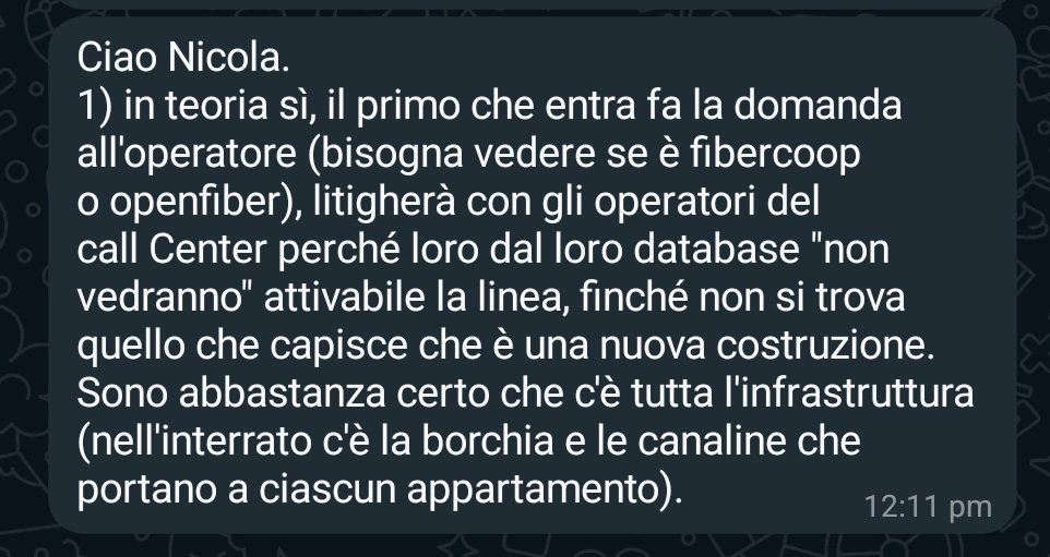 Ceeerto... come no. Presumo che con borchia e canaline intenda appunto l'impianto multiservizi (quello sì obbligatorio). Mi faccio un giretto di coperture col civico provvisorio: FTTC più o meno tutti, un paio di FWA.