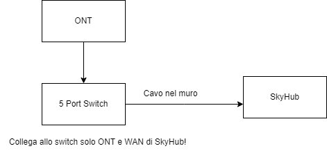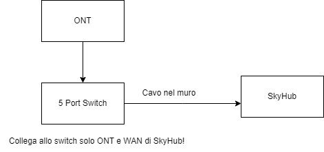 - Sala da pranzo: borchia OF, ONT e router Sky -> non ho spazio per metterci un mobiletto e non so come fare "sparire" dal pavimento tutta quella roba. Leggendo altre discussioni qui sul forum, mi pare di capire che l'unica cosa che posso realisticamente far sparire (senza ribaltare tutto) è spostare il router, mentre su borchia OF e ONT è un po' una rottura di balle modificare la situazione. Nota: la sala da pranzo a ora lo uso come studio, perché come vi dirò dopo non riesco ancora a fare arrivare la connessione nel "vero" studio;