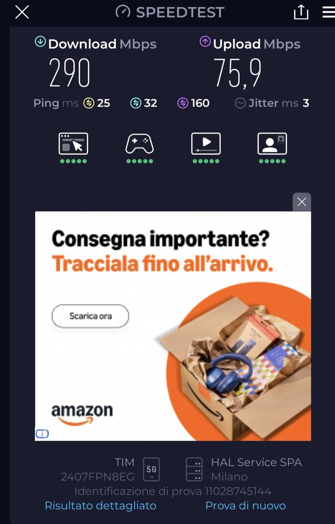 steve0102 Ragazzi ho risolto acquistando un altra sim sempre a 7,99,confermo che funziona regolarmente il 5g,poi la vecchia vedo se riesco a fare un recesso per mancata attivazione o qualcosa del genere,purtroppo per lavoro non potevo più attendere ad aspettare che attivassero il 5g. Allego speedtest
