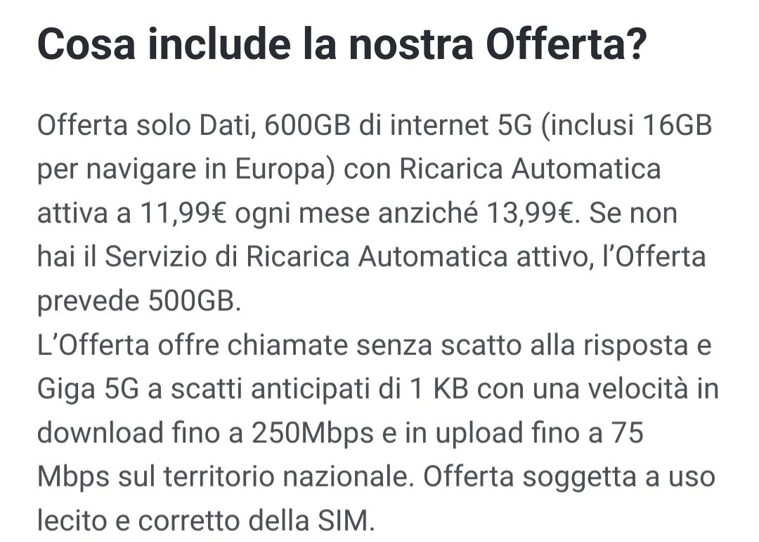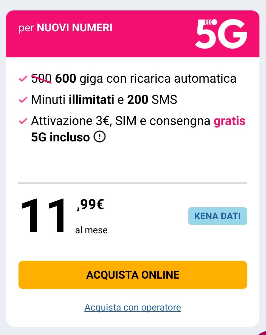 _Lex_ fabrizioo34 Vero, e pure per le offerte In 5G Ultra vedo. Thanks. PS: Ho provato a scomodare KenaAI: per nuovi numeri mi consiglia una Kena 9.99 SIM&GO con 100GB in 4G a 9.99€/mese. Probabilmente non l'aggiornano da anni.