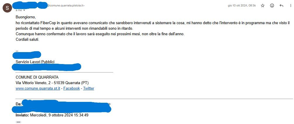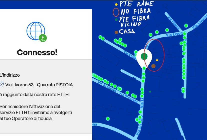 Ricontattando il Comune mesi dopo per avere nuove comunicazioni con FiberCop, mi è stato risposto in modo vago dicendomi che non sarebbero intervenuti perché da me perché alla cabina non sono stati fatti lavori per la fibra🤔. Questa informazione è errata però: la mia abitazione è connessa allo stesso armadio del mio vicino a cui è stata portata la fibra, siamo tutti serviti dal medesimo armadio (quello di Via di Folonica 136 con codice 57303A_7210) è stato confermato anche a seguito di una analisi di un tecnico Fibercop eseguita quando è venuto per un civico vicino, anche lui mi ha detto la stessa cosa, l'installazione dal pte del vicino sarebbe tranquillamente fattibile ma essendo io assegnato a quello in rame dell'altra casa non può farlo senza bonificare il civico e che non ha senso che abbiano lasciato questi civici visto che sono completamente circondati dalla rete in fibra, successivamente mi ha anche richiamato dicendomi di aver mandato una segnalazione interna per provare a risolvere la cosa consigliandomi di contattare il mio operatore per richiedergli di mettere una richiesta di attivazione fibra alla mia abitazione e dopo la sua segnalazione sarebbero tornati (avendo purtroppo Tim, spiegare questa cosa all'assistenza è come spiegarla ad un muro, infatti non vedo l'ora che arrivi la fibra per togliermi da loro...).