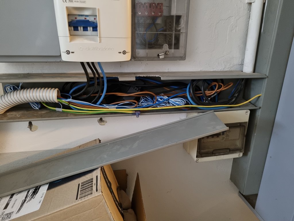 Fino ad un mese fa erano presenti questi due corrugati (foto sotto), dove immaginavo avrebbero messo una backup box. Però a pensarci, anche mettendo quella scatola il condominio non avrebbe potuto sfruttare a pieno le batterie, essendo che sono supportati solo carichi monofase (4 luci esterne e le luci scala) e quelli trifase (2 ascensori, pompe teleriscaldamento, etc) no. C'è poi il fatto che è stato tirato un solo cavo trifase dagli inverter alla cantina per l'allaccio alla rete, uno per la comunicazione con le pinze amperometriche e non anche un cavo monofase per allacciare le utenze condominiali (i quadri elettrici sono nelle cantine vicino al contatore).