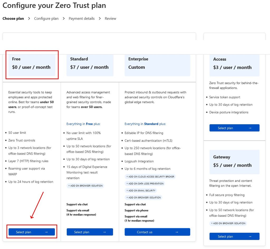 e mi porta in questa schermata, dove clicco Free e clicco Select plan