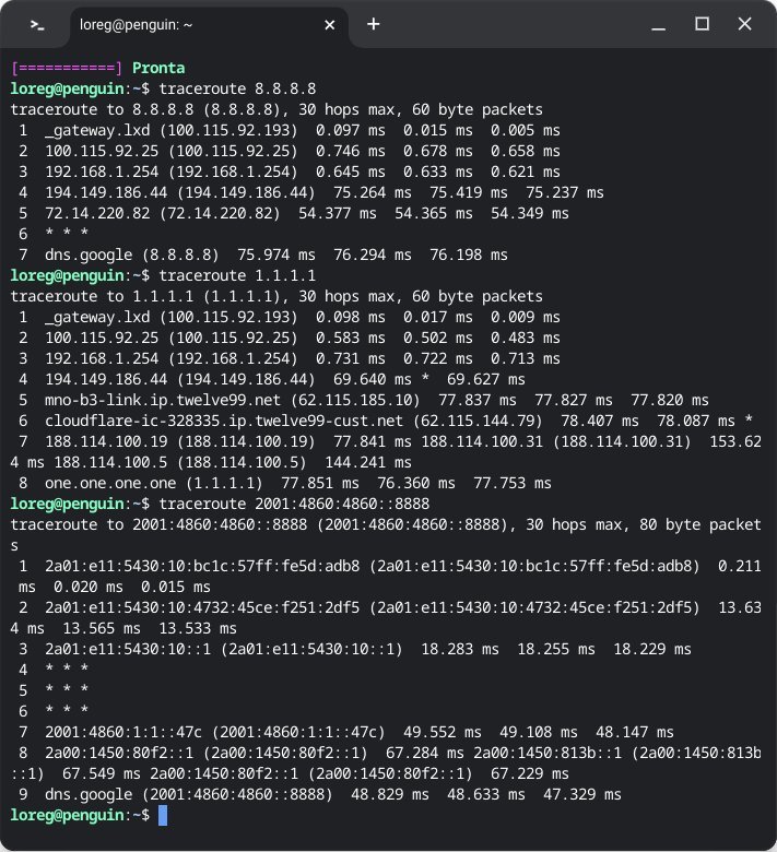 iosonofra cravatta rispondo qui, ho già segnalato all'assistenza che però.... nulla. |------------------------------------------------------------------------------------------| | WinMTR statistics | | Host - % | Sent | Recv | Best | Avrg | Wrst | Last | |------------------------------------------------|------|------|------|------|------|------| | console.gl-inet.com - 0 | 47 | 47 | 0 | 0 | 0 | 0 | | 100.64.255.255 - 9 | 36 | 33 | 30 | 30 | 32 | 31 | | host13-110-32-195.dimensionesrl.eu - 9 | 36 | 33 | 30 | 32 | 47 | 30 | | 10.100.10.9 - 21 | 24 | 19 | 40 | 41 | 43 | 42 | | 72.14.221.8 - 3 | 42 | 41 | 0 | 43 | 108 | 41 | | 192.178.104.99 - 9 | 36 | 33 | 38 | 41 | 45 | 42 | | 142.250.211.29 - 10 | 31 | 28 | 0 | 41 | 46 | 41 | | dns.google - 9 | 36 | 33 | 38 | 40 | 45 | 40 | |________________________________________________|______|______|______|______|______|______| WinMTR v0.92 GPL V2 by Appnor MSP - Fully Managed Hosting & Cloud Provider |------------------------------------------------------------------------------------------| | WinMTR statistics | | Host - % | Sent | Recv | Best | Avrg | Wrst | Last | |------------------------------------------------|------|------|------|------|------|------| | console.gl-inet.com - 0 | 58 | 58 | 0 | 0 | 0 | 0 | | 100.64.255.255 - 2 | 54 | 53 | 30 | 31 | 33 | 32 | | host13-110-32-195.dimensionesrl.eu - 5 | 48 | 46 | 30 | 32 | 48 | 30 | | cloudflare.rom.namex.it - 4 | 51 | 49 | 31 | 35 | 60 | 33 | | one.one.one.one - 4 | 51 | 49 | 31 | 31 | 33 | 31 | |________________________________________________|______|______|______|______|______|______| WinMTR v0.92 GPL V2 by Appnor MSP - Fully Managed Hosting & Cloud Provider speedtest