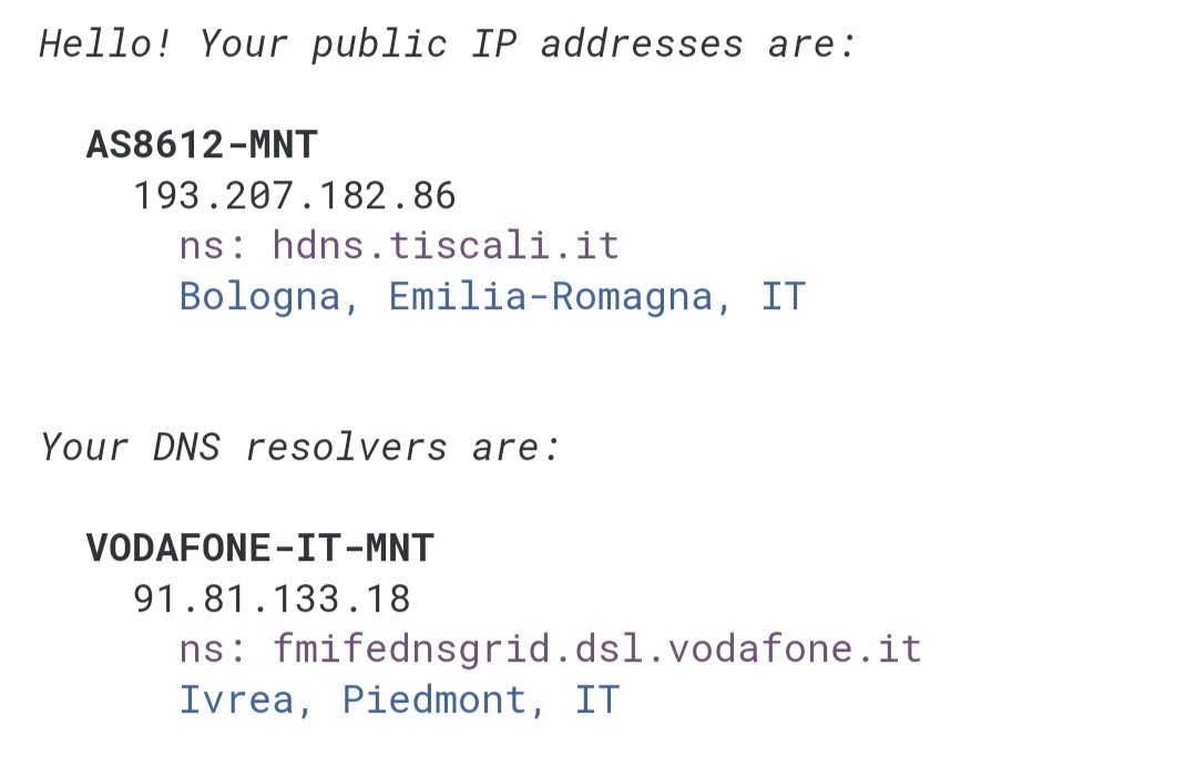 e questa con una SIM fisica, connessa a Vodafone, DNS Vodafone e transito Tiscali: