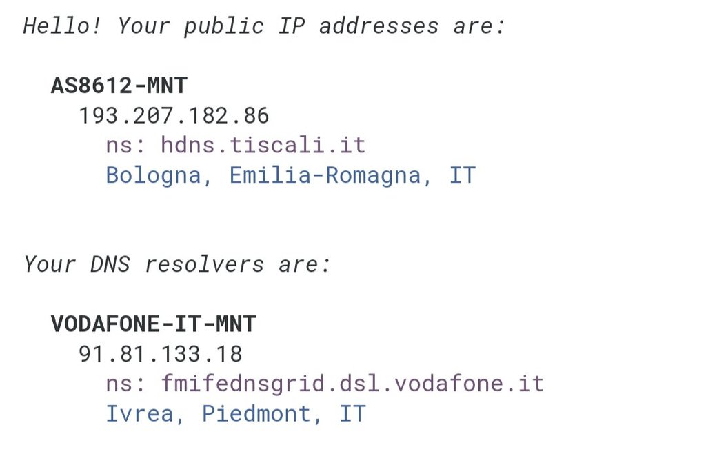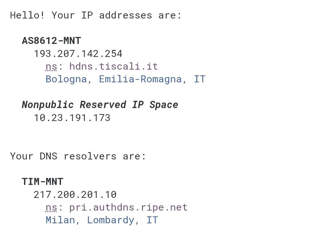 Tipo questa con una eSIM: connessa a TIM, DNS TIM e transito Tiscali.