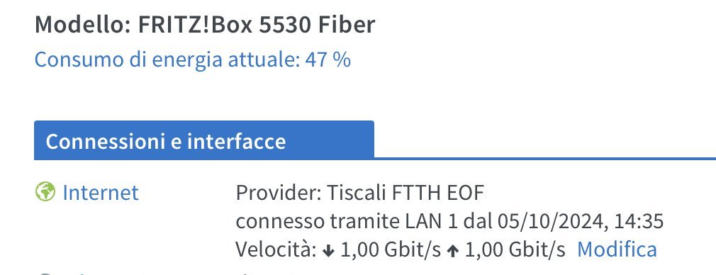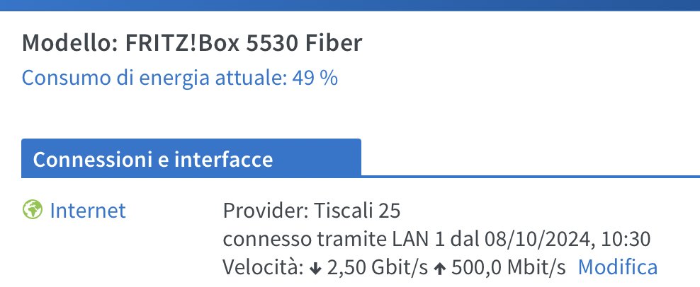 linux1si biglia6 non ti preoccupare, è solo un bug grafico per come è configurato il Fritz box. Se fai speedtest tramite wifi 6 supererai il Gigabit senza problemi. Se vuoi risolvere questa cosa, devi creare una nuova connessione dati selezionando altro operatore e inserire i parametri di connessione e di velocità.