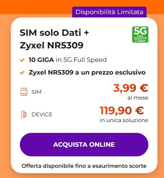 onda stich86 Grazie, forse quello più economico in assoluto ad oggi è questo https://www.windtre.it/offerte-internet-mobile/super-internet-start-e-stop-e-zyxel-nr5309#tabs-9a1bf3eca8-item-e72e03d03b-tab Zyxel NR5309 a 129 euro Qualcosa invece che non ha vincoli e quindi prepagato come spesso gli operatori hanno la FWA su rete 5g non c'è nulla sulle 100 euro? Come mai costano ancora così tanto ed un cellulare 5g invece per assurdo costa meno?
