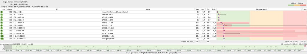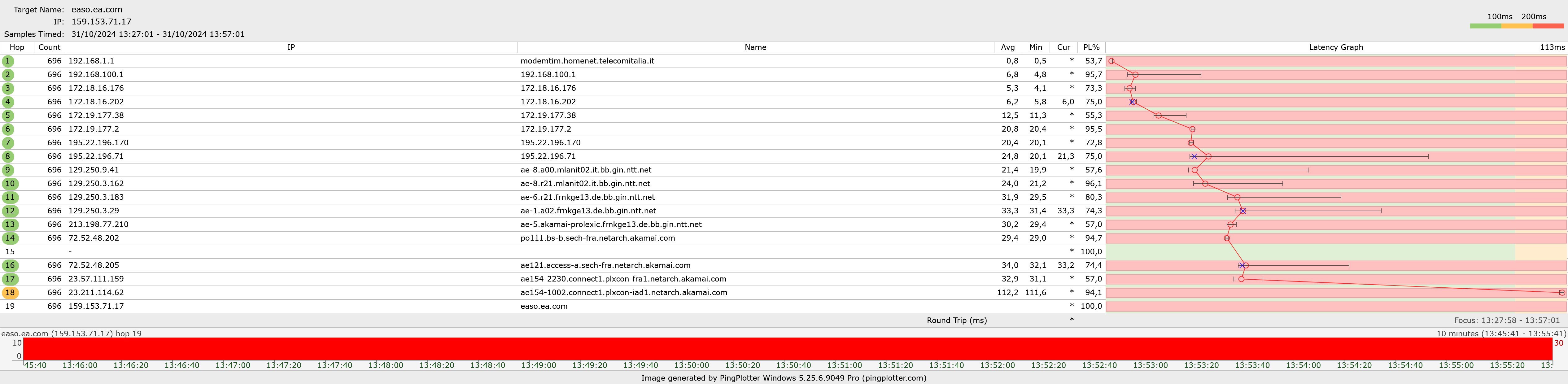 Sto riscontrando una perdita di pacchetti elevatissima e un jitter costante, che rendono praticamente impossibile utilizzare la rete in modo fluido. Ho allegato uno screenshot dei risultati di un test effettuato con PingPlotter (vedi immagine allegata) per darvi un'idea della gravità della situazione.