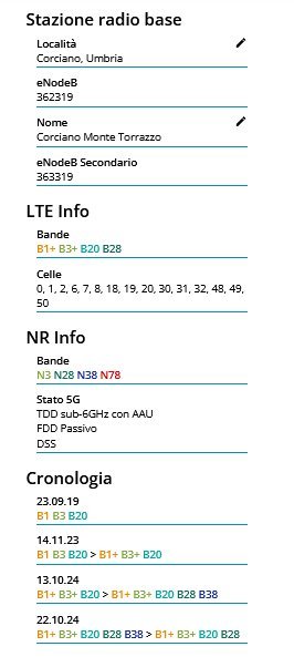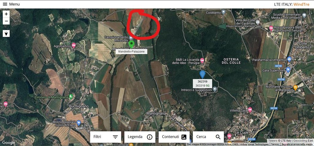 Salve a tutti, sono nuovo del forum ma è già dall'anno scorso che seguo il forum, precisamente da prima di passare finalmente dall'ADSL mediocre di TIM, che nella mia zona era si stabile (anche se con il maltempo negli ultimi tempi erano più le ore in cui non avevo linea che quelle in cui riuscivo a navigare), ma veramente limitante, specialmente se in casa ci sono 3 computer e diversi device che devono lavorare, a volte anche tutti insieme. Ovviamente, niente FTTH, e ai tempi neanche FTTC, o meglio, alcune erano disponibili ma parlando con conoscenti della mia frazione mi sconsigliavano questa opzione. Feci la richiesta anche per EOLO, ma quando venne il tecnico, mi disse che era impossibile effettuare l'installazione. Iniziai, quindi, ad informarmi sulla tecnologia FWA, anche qui sul forum, in quanto, avendo una BTS perfettamente a vista, e essendo la mia frazione comunque poco popolata, pensai che potesse essere una valida soluzione, viste anche le tariffe alle quali essa veniva proposta (con ADSL Tim infatti, pagavo 70 euro al mese per velocità di 8 Mbps e 0.7 Mbps). La BTS in questione è quella riportata nella foto, che ai tempi in cui stipulai il contratto aveva solo le bande 1+, 3+ e 20. Il cerchio rosso è la posizione approssimativa di casa mia. Dal tetto di casa, dove attualmente è installata la CPE ZTE MC889, ho piena e libera vista sulla BTS in questione, che è anche l'unica nel raggio di km, come potete vedere dalla mappa.