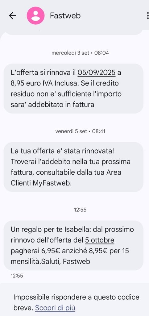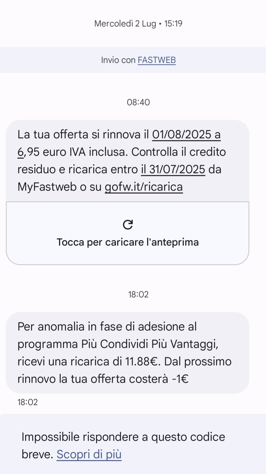 FabioDarconte _Lex_ è per questo avevo chiesto se anche altri utenti del forum avevano ricevuto lo stesso messaggio, del bonus tramite credito residuo e più lo sconto di 1€