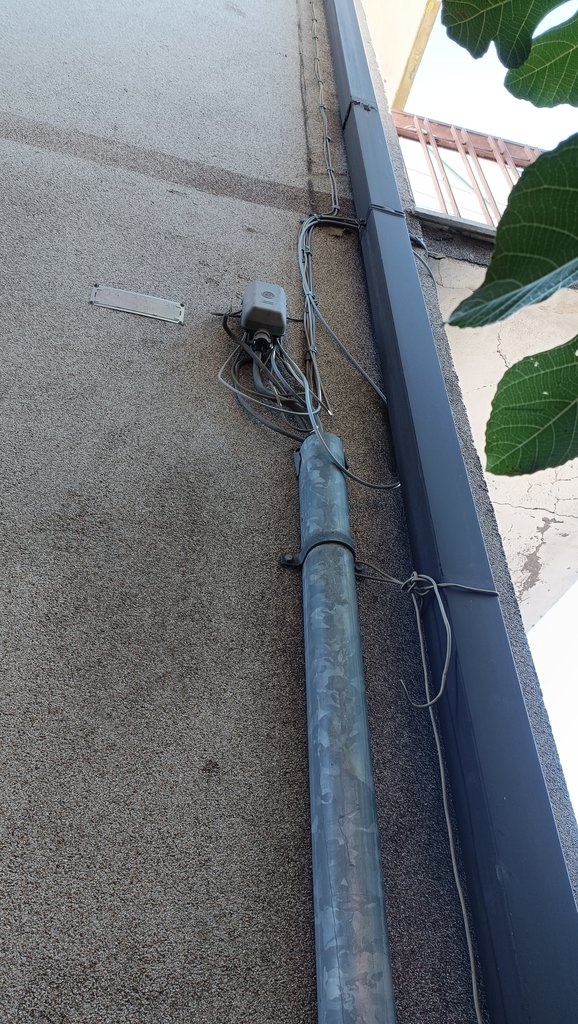 Per spiegarvi meglio la situazione, dal quadro elettrico il cavo va in una serie di pozzetti dentro la mia proprietà (circa 30m) poi esce fuori dal cancello, attraversa un piazzale libero ma di un altro proprietario (circa 60m), sale sulla parete di un edificio (dello stesso proprietario) e arriva nella cassettina che vedete in foto.