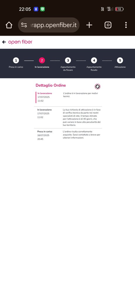 La informiamo che, poiché il suo comune è di recente apertura alla vendibilità del servizio, siamo in attesa che Open Fiber ci fornisca alcuni dati necessari all'attivazione del collegamento con la sua centrale. Non appena riceveremo tali informazioni, provvederemo ad avviare le pratiche di attivazione.