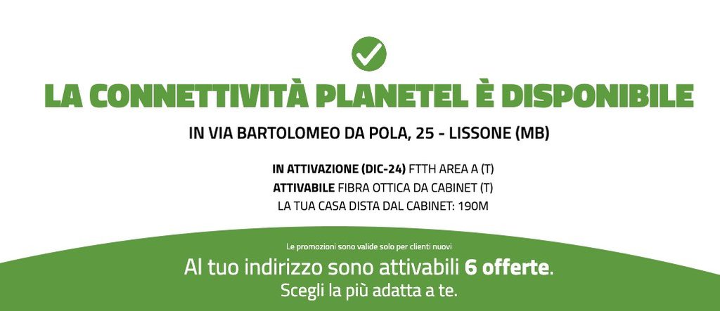 enricoz ivan5150 Dimensione da FTTH già vendibile(?) con stato in attivazione... Potresti mandare uno screenshot? Sembra una prevendibilltà che su FiberCop non avevo mai visto. In realtà controllando il tuo indirizzo (Via Da Pola 25) non mi esce questa dicitura ma solo FWA/FTTC