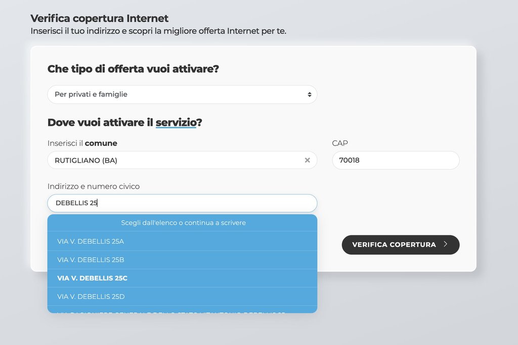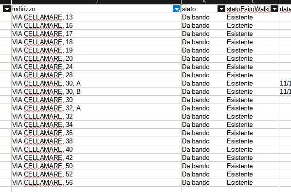 enricoz Va bene grazie, generalmente capisco dai civici se è la mia via o l'altra. In via vitantonio de bellis c'è solo il 25, mentre nella mia ci sono 25 a b c d