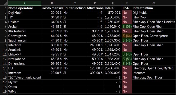 Ho fatto uno spreadsheet con gli operatori che offrono la Fibra 10 Giga a privati, e le relative offerte.