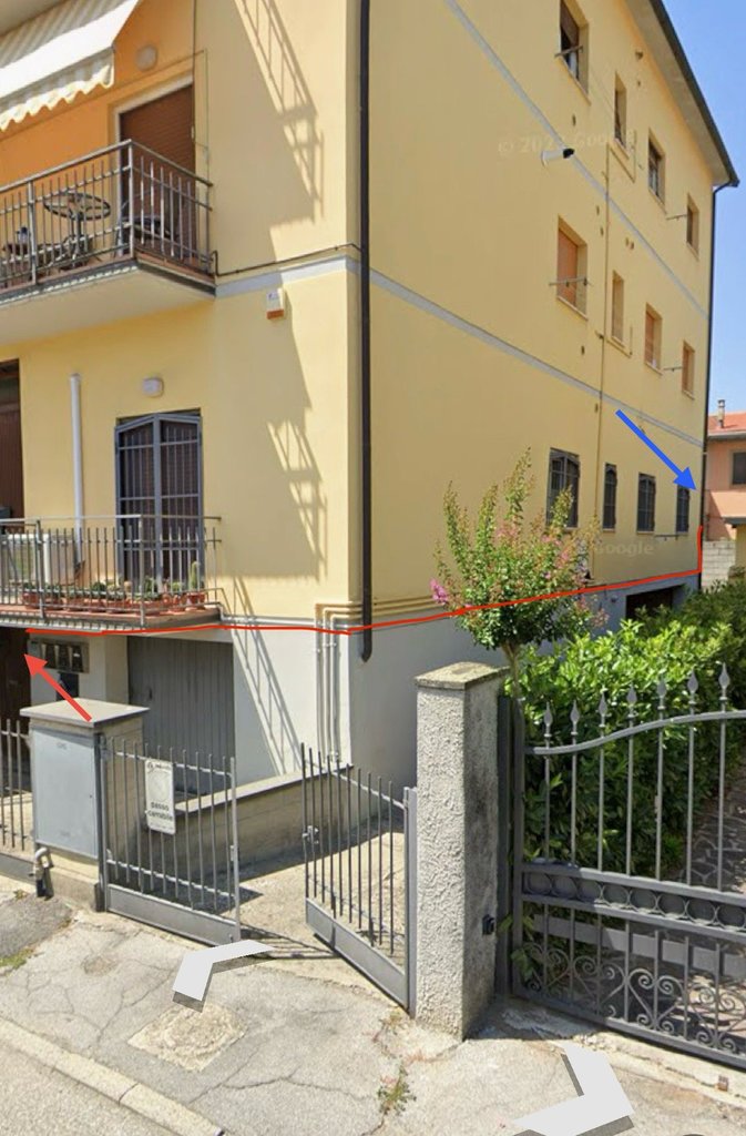 Poi scendono (freccia blu è dove dietro c’è il pte) vanno dentro una canalina (percorso in rosso) ed entrano nel locale contatori condominiale (porta indicata con freccia rossa).