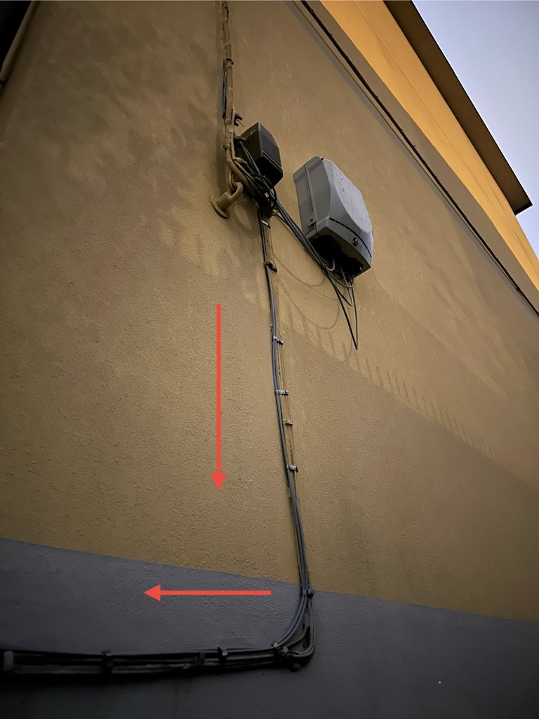 La parte esterna che ho tracciato in rosso passa dentro una canalina di plastica fissata al muro che è piena, o rimuove il mio doppino con tutta la guaina oppure deve passare il cavo esterno alla canalina magari attaccato sotto.