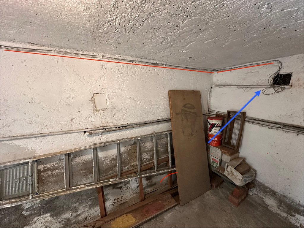 Poi dal corridoio va nel ripostiglio tramite un corrugato libero ci passava solo il doppino. Arriva dal pianerottolo (freccia rossa, sarà 1-2metri) e poi scende giù nel corridoio (freccia blu, un altro metro circa)