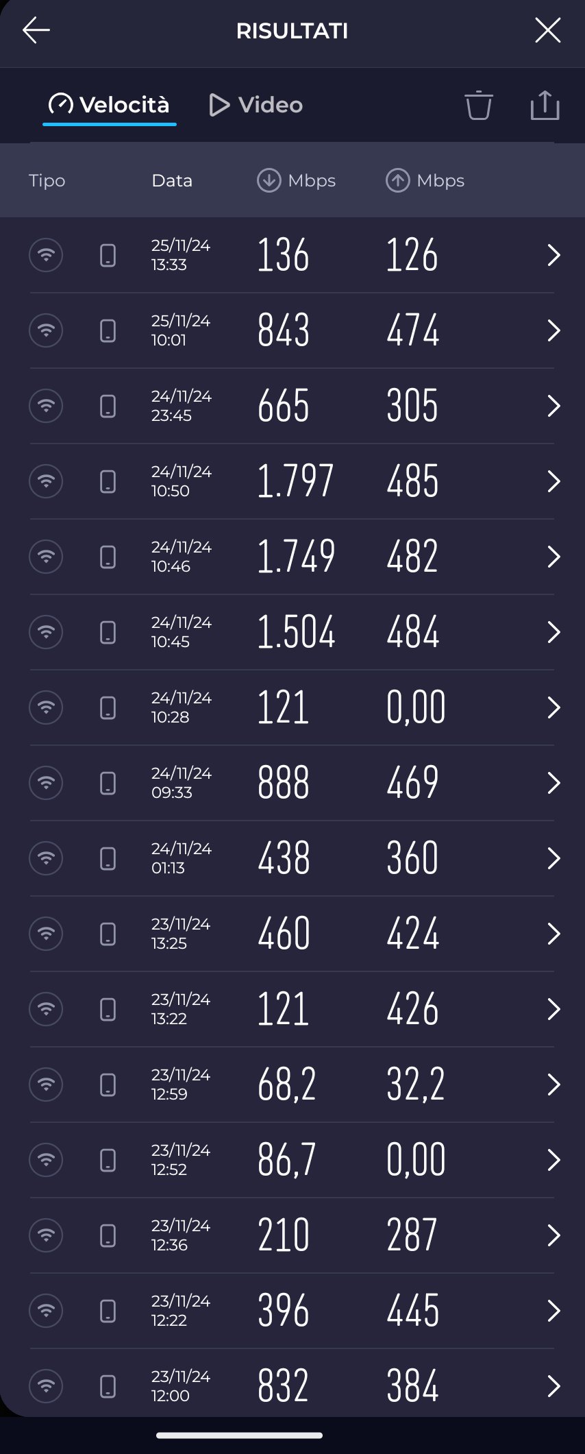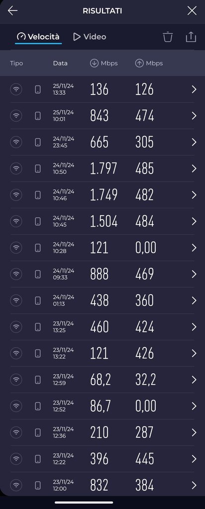 limewire Ciao a tutti! Ho la fibra di Poste Ultra casa fino a 2.5 tramite OpenFiber. Facendo lo speedtest (al momento non ho cavo ethernet a portata di mano quindi rilevate tutte tramite wifi) riscontro durante l'arco della giornata forti variazioni di velocità. Resettando router e ont la situazione non sembrerebbe cambiare cioè la velocità rimane pressoché identica a quella rilevata prima del riavvio.