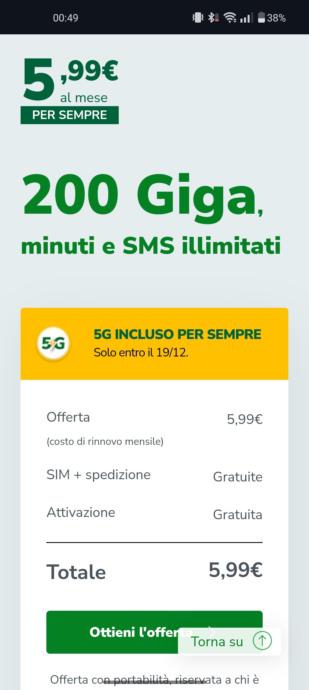 MentalBreach fnittoli Le tariffe da 4,99 € non hanno il 5G incluso per sempre, controlla a fine marzo se scadrà l'opzione. _Lex_ non esiste neanche la sintesi precontrattuale in cui è specificato che la velocità massima ipoteticamente raggiungibile è 2000Mbps. Esatto, ho cercato nel sito ma non sono riuscito a trovarla.